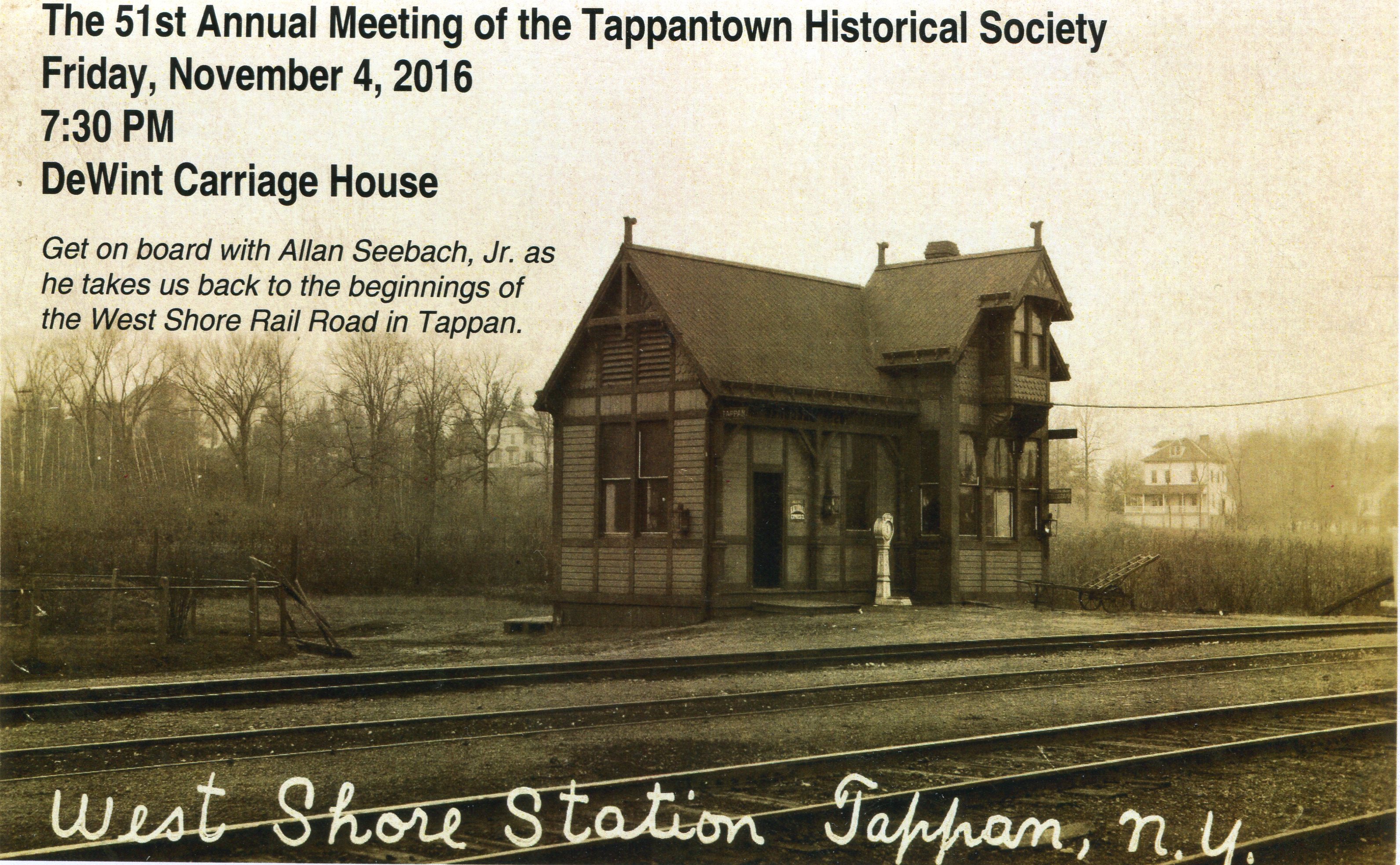 The 51st Annual Meeting of the Tappantown Historical Society Friday, November 4, 2016 7:30 pm DeWint Carriage House Get on board with Allan Seebach, Jr. as he takes us back to the beginnings of the West Shore Rail Road in Tappan.