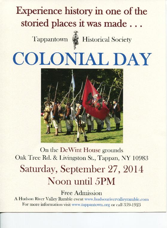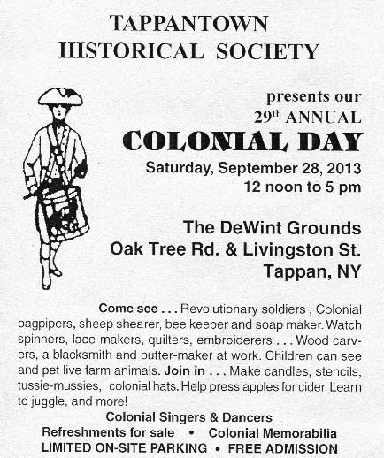 Tappantown Historical Society invites you to our 33rd Annual COLONIAL DAY Saturday, September 23, 2017 from 12PM to 5PM at the DeWint House ( Oak Tree Road and Livingston Street , Tappan , NY 10983 ) Step back in time and visit Colonial America... Come see Colonial Army Re-enactors and Encampment Soldiers Colonial Singers and Dancers Quilting Embroidery Lacemaking See a Blacksmith, Wood Carver, Bee Keeper and Soap Maker. Ladies and Gentlemen in Colonial Attire preparing for Winter in the DeWint House Kitchen For the children: apple pressing, stenciling, candle-dipping, spinning, butter-making, Colonial Apron Making, writing with quill pen Farm Animals Sheep Shearer Tour The Carriage House Museum and DeWint House REFRESHMENTS AVAILABLE LIMITED ON-SITE PARKING (priority given to disabled) FREE ADMISSION |