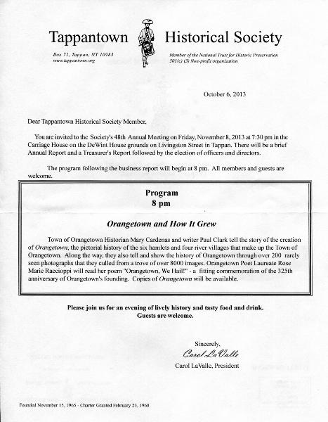 Celebrating 325 years of Tappan history - 1686-87 to 2011-12 Press release: From: Tappantown Historical Society, Carol LaValle, President, phone 359-1923 Marilyn Schauder, publicity, phone 358-7243 Subject: Tappantown Historical Society’s Annual Dinner and Achievement Awards 2012 The Tappantown Historical Society will recognize the special contributions of members of our community who have helped foster the Society’s goals of preservation, protection, and education at its 47th Annual Awards Dinner on Friday, February 24, at the ’76 House. This year, as we commemorate the 325th anniversary of the Tappan or Orangetown Patent, we are pleased to announce the recipients of this year’s Tappantown Achievement Awards: Jamie Kempton, Ed Kopf, Dan Sherman, and Larry Vail of the Sparkill History Project for organizing Sparkill History Day, July 23, 2011, at which people shared old photographs, maps, and memories, and which also celebrated Christ Church Sparkill’s designation as an historic site by the New York State and the National Registries of Historic Places. Orangetown Historian Mary Cardenas and writer Paul Clark for authorship of the pictorial history Orangetown, published by Arcadia Publishing in its Images of America series. Anthony and Michael Fasciano for their restoration of the interior of Giulio’s, which brings new life and light to the restaurant in the 1880's Queen Anne style house on Washington Street in Tappan. In commemoration of Orangetown’s 325 years, the Historic Society will exhibit the restored 1704 Division Patent that belonged to Peter J. Haring, one of the original 16 patentees of the 1686-87 Patent that established Orangetown. The 1704 vellum document describes those lands deeded to Peter J. Haring from the land held in common by the original signers of the 1686/7 Tappan Patent. All are welcome, members and non-members, to celebrate these accomplishments. |