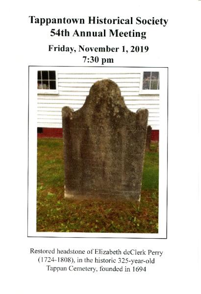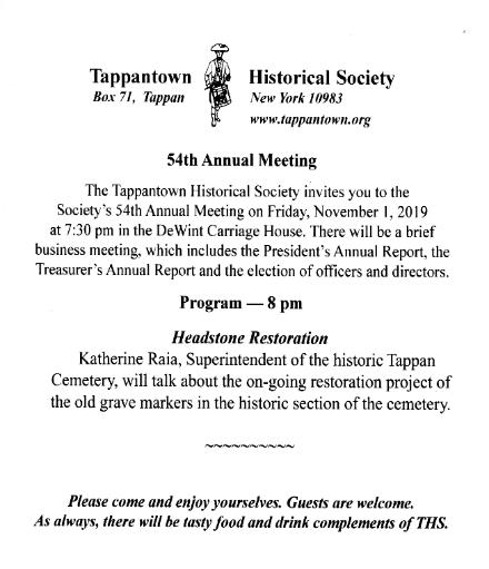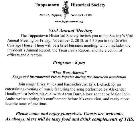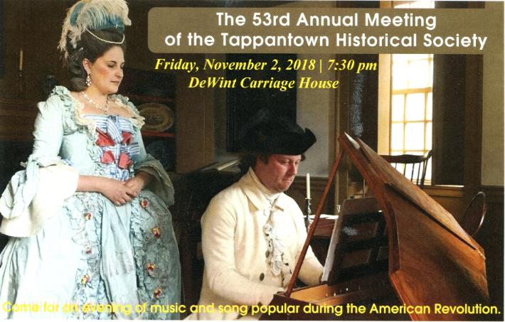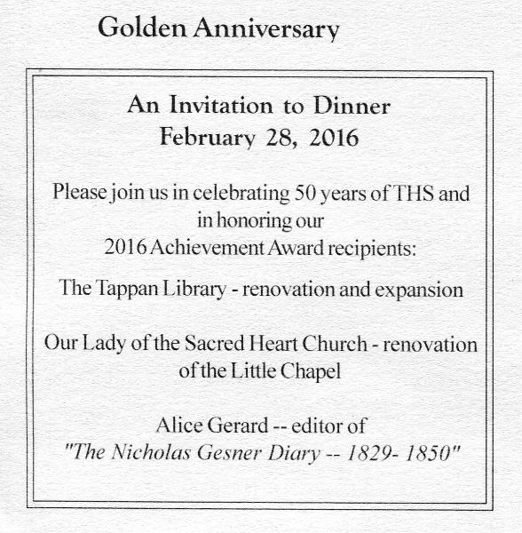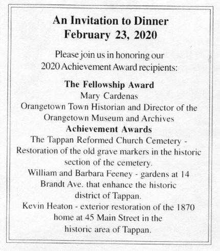 Celebrating Our 53rd Annual Dinner and Achievement Awards 2019 The Tappantown Historical Society begs leave to inform you that on Sunday, February 24, 2019 commencing at FIVE THIRTY sharp in the evening there will be good food and victuals at The Old '76 House. |