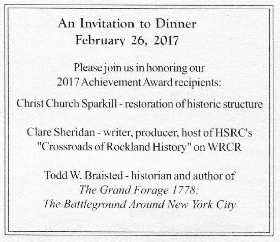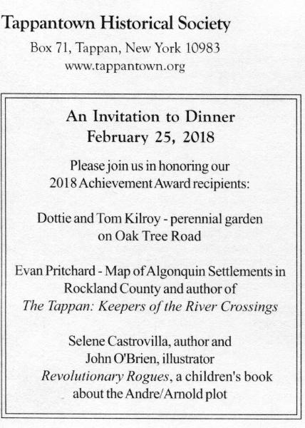 Celebrating Our 52nd Annual Dinner and Achievement Awards 2018 The Tappantown Historical Society begs leave to inform you that on Sunday, February 25, 2018 commencing at FIVE THIRTY sharp in the evening there will be good food and victuals at The Old '76 House. (Click Here to View and Print the Invitation) |
