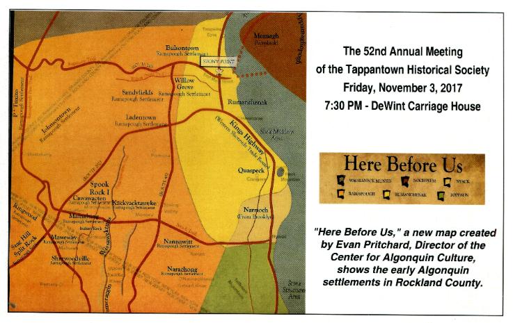 The 52nd Annual Meeting of the Tappantown Historical Society Friday, November 3, 2017 at 7:30 pm DeWint Carriage House 52nd Annual Meeting The Tappantown Historical Society invites you to the Society’s 52nd Annual Meeting on Friday, November 3, 2017, at 7:30 pm in the DeWint Carriage House. There will a brief business meeting, which includes the President’s Annual Report, the Treasurer’s Report, and the election officers and directors. Program — 8pm The Tappan: A People and a Place In this lecture/slide show, Mi'kmaq/Celtic author and award winning historian Evan Pitchard will discuss the Tappan as a river people of the Algonquin nations who thrived here for centuries, and also explore Tappan as a place name with a multi-cultural variety of meanings. He will unveil a newly-published map of Rockland County entitled "Here Before Us," revealing many Algonquin settlements, trails and waterways throughout the county, including their original names in the Lenape language. There will be a brief Q and A, followed by book signing. Please come and enjoy yourselves. Guests are welcome. As always, there will be tasty food and drink compliments of THS. |