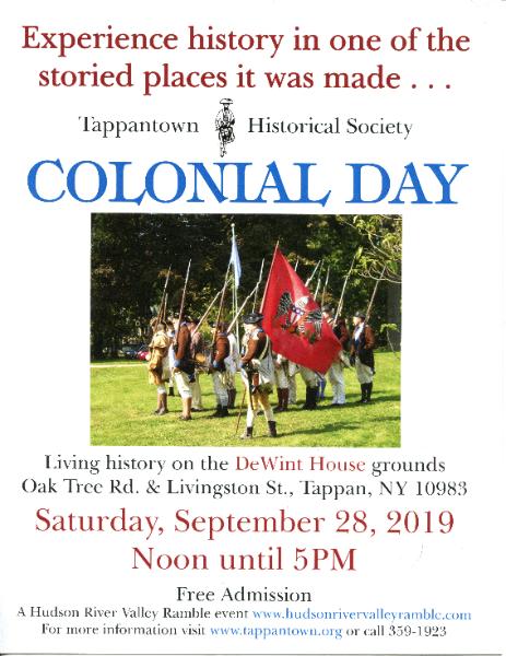 35th Annual COLONIAL DAY Saturday, September 28, 2019 from 12PM to 5PM at the DeWint House ( Oak Tree Road and Livingston Street , Tappan , NY 10983 ) Step back in time and visit Colonial America... Come see Colonial Army Re-enactors and Encampment Soldiers Colonial Singers and Dancers Quilting, Embroidery, Lacemaking See a Blacksmith, Wood Carver, Bee Keeper and Soap Maker. Ladies and Gentlemen in Colonial Attire preparing for Winter in the DeWint House Kitchen For the children: apple pressing, stenciling, candle-dipping, spinning, butter-making, Colonial Apron Making, writing with quill pen Farm Animals Sheep Shearer Tour The Carriage House Museum and DeWint House REFRESHMENTS AVAILABLE LIMITED ON-SITE PARKING (priority given to disabled) FREE ADMISSION |
